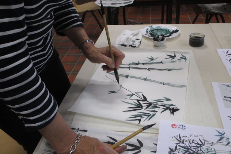 Par une étude pas-à-pas, chacun(e) à son propre rythme pourra mettre en pratique à l'encre de Chine et pinceau chinois, par le Regard-Présence, la forme du bambou dans un premier temps, puis l'esprit du bambou, l'essence même de sa vérité.